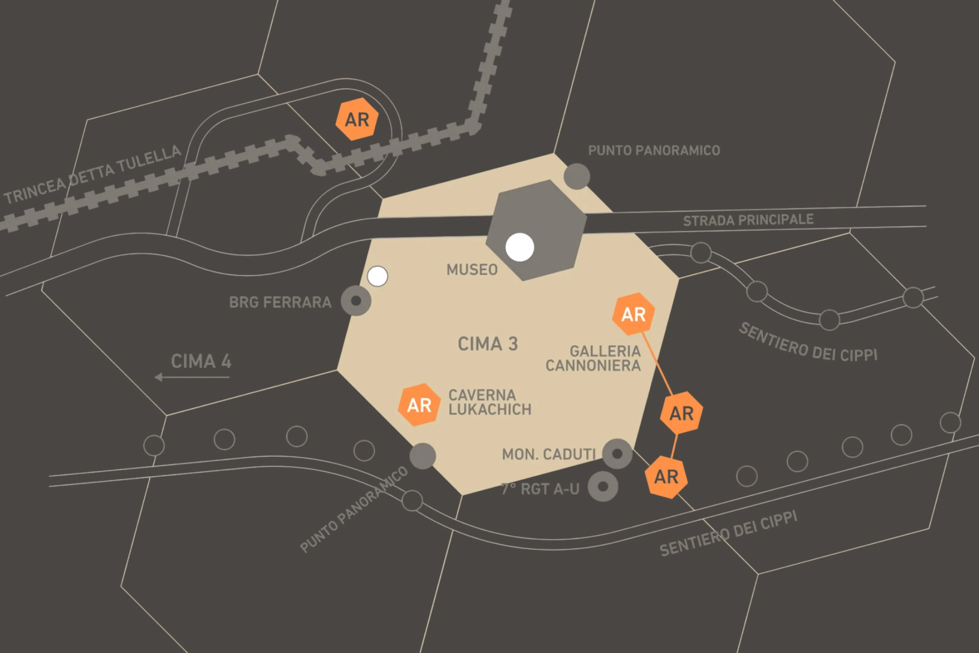 The museum's offer is enriched by Augmented Reality (AR). Accessible in some points of the outdoor museum itinerary through the San Michele VR mobile app, it is dedicated to the entire sacred area. It will give you more information about the monuments, the visit routes, the galleries of Cima 3 and the entrenched lines.