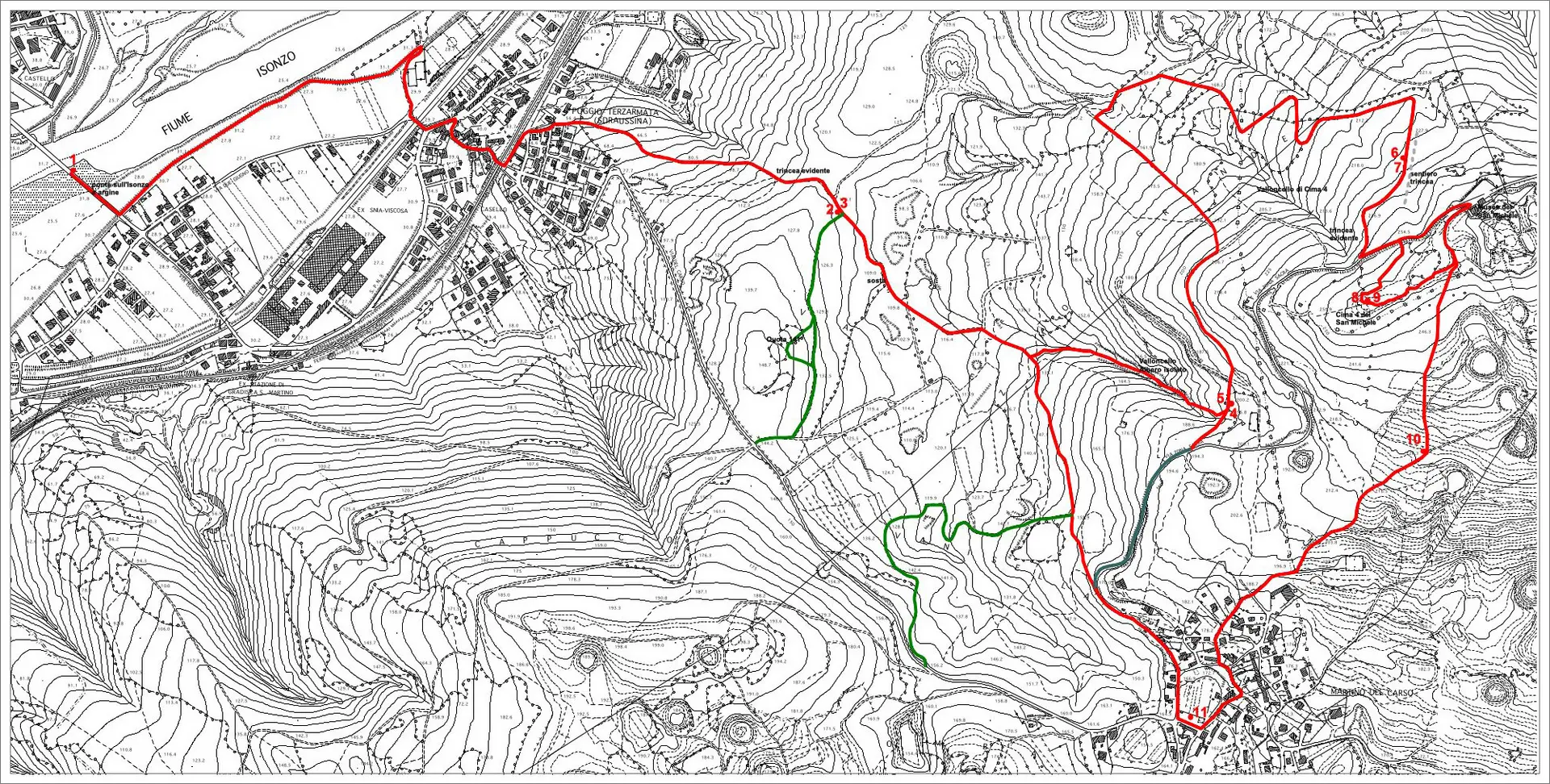 The circular trail is part of the “Microcosmi carsici” (Karst Microcosms) project involving the municipalities of Sagrado, Savogna d'Isonzo, and Doberdò del Lago. It retraces the places that inspired Giuseppe Ungaretti's work and his poem Il Porto Sepolto (The Buried Port), in synergy with the “Parco Ungaretti” in Castelnuovo and the battle fields of the Great War on Monte San Michele.